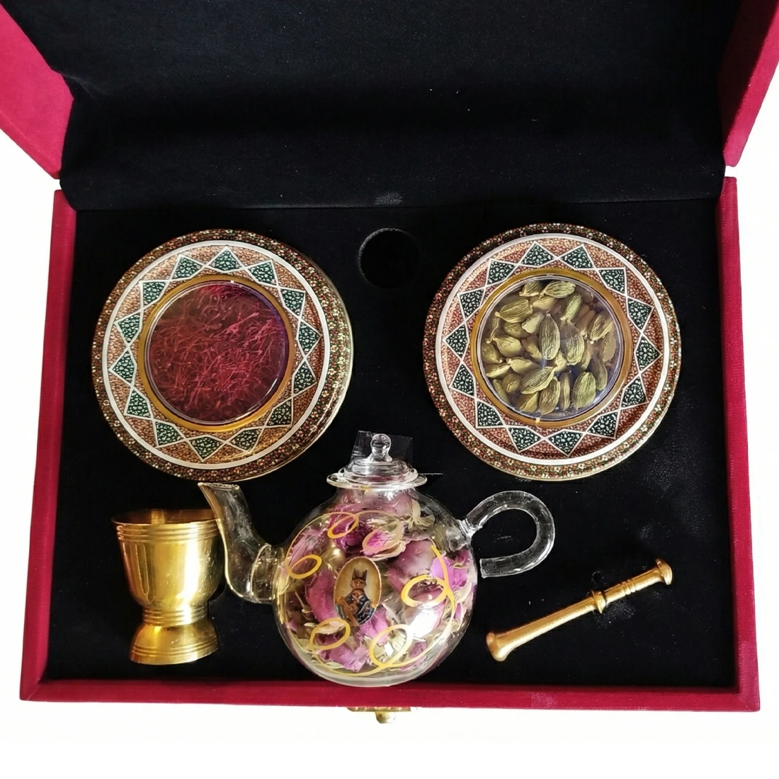 - وزن: 10 گرم هل + گل محمدی + هاون + قوری